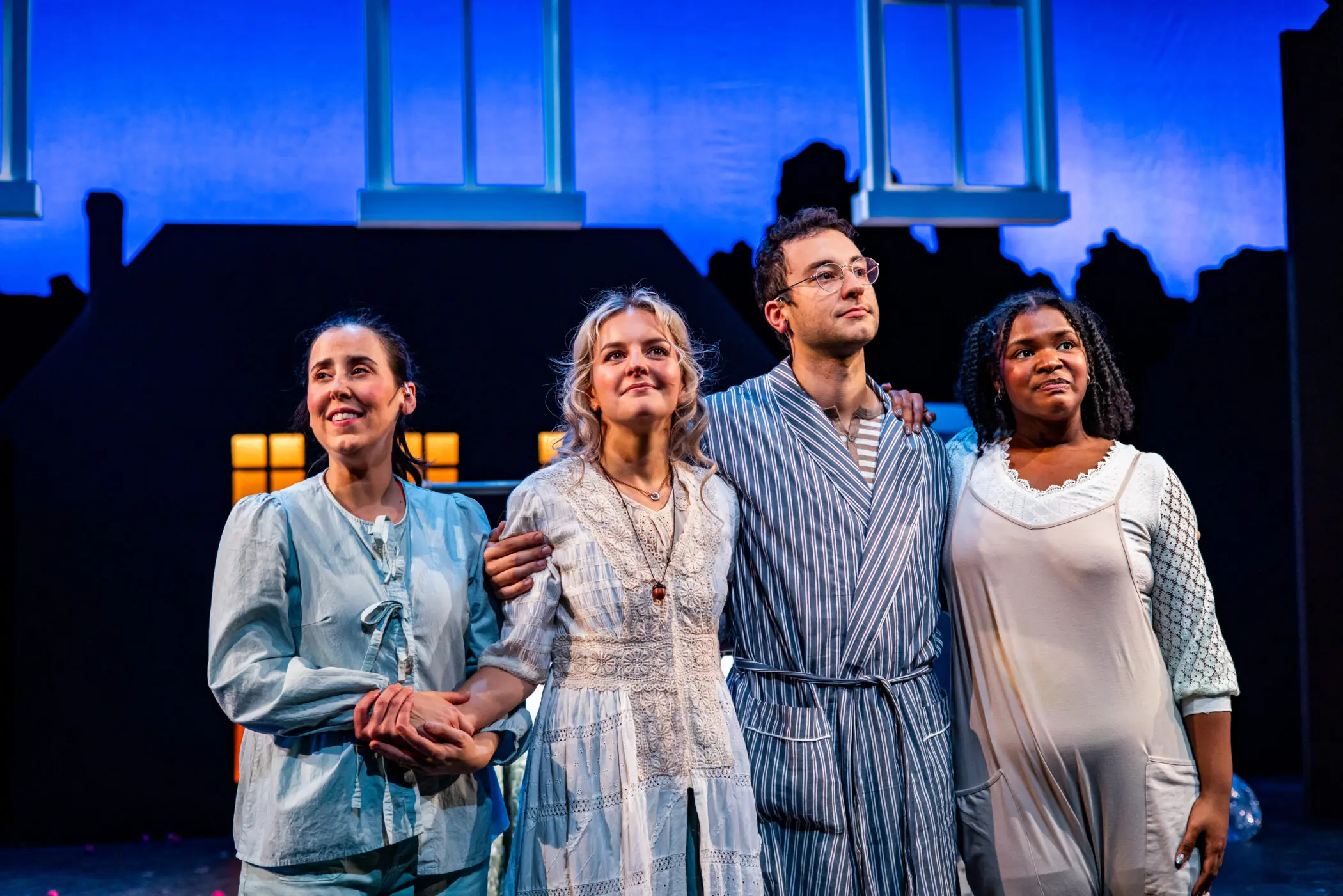 Adam Howard (Michael Darling), Campbell O’Hare (Wendy Darling) , Lee Minora (Smee), and Jo Vito Ramirez (Peter Pan) in Arden Theatre Company’s 2024/25 production of Peter Pan. Photo by Ashley Smith, Wide Eyed Studios.